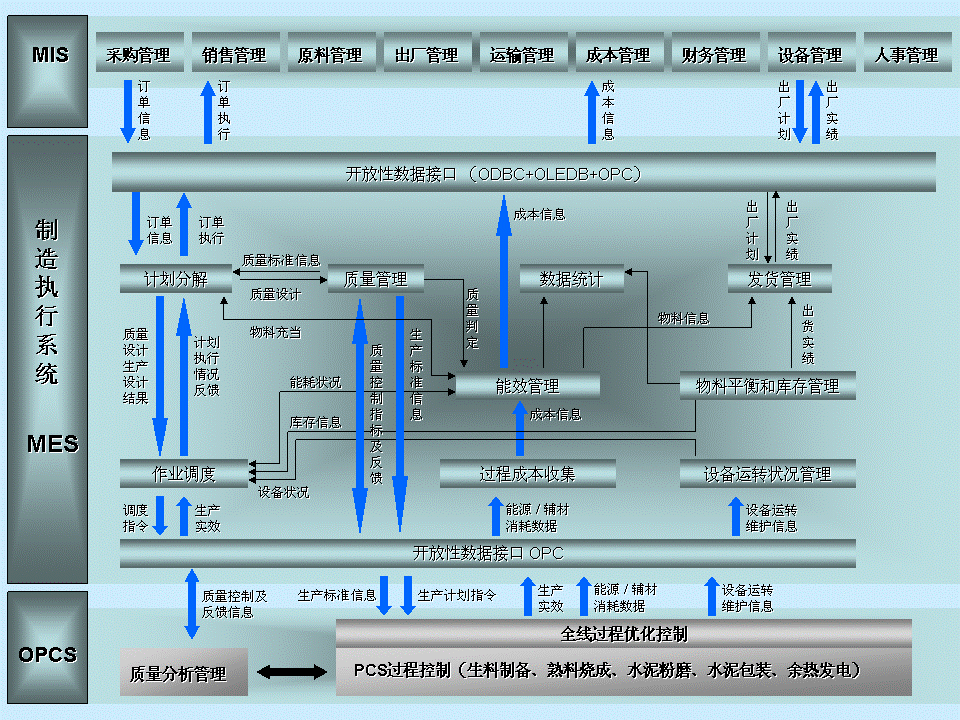 采用MES系統實(shí)現生產(chǎn)管理,包括能源管理、倉儲管理、設備管理等各個(gè)重要環(huán)節的物流管理、成本管理等功能。
